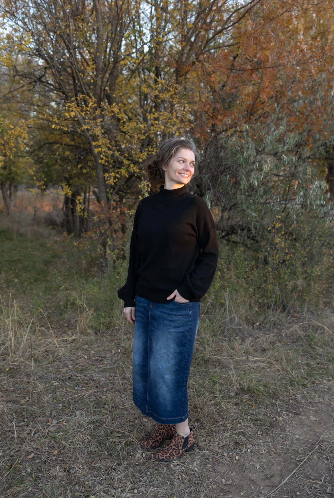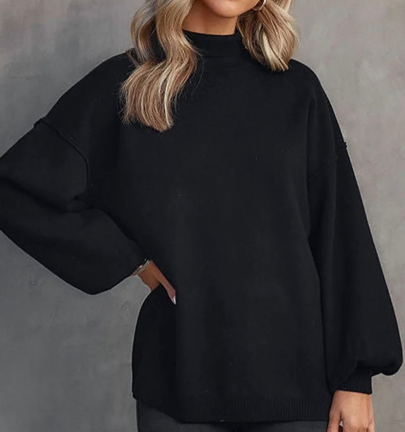 This sweater features a turtleneck, lantern sleeves and reverse seems. It can be dressed up or worn casually.