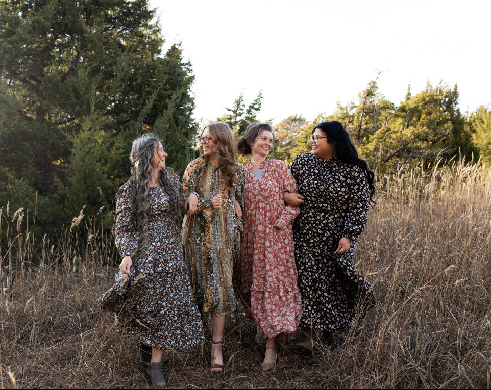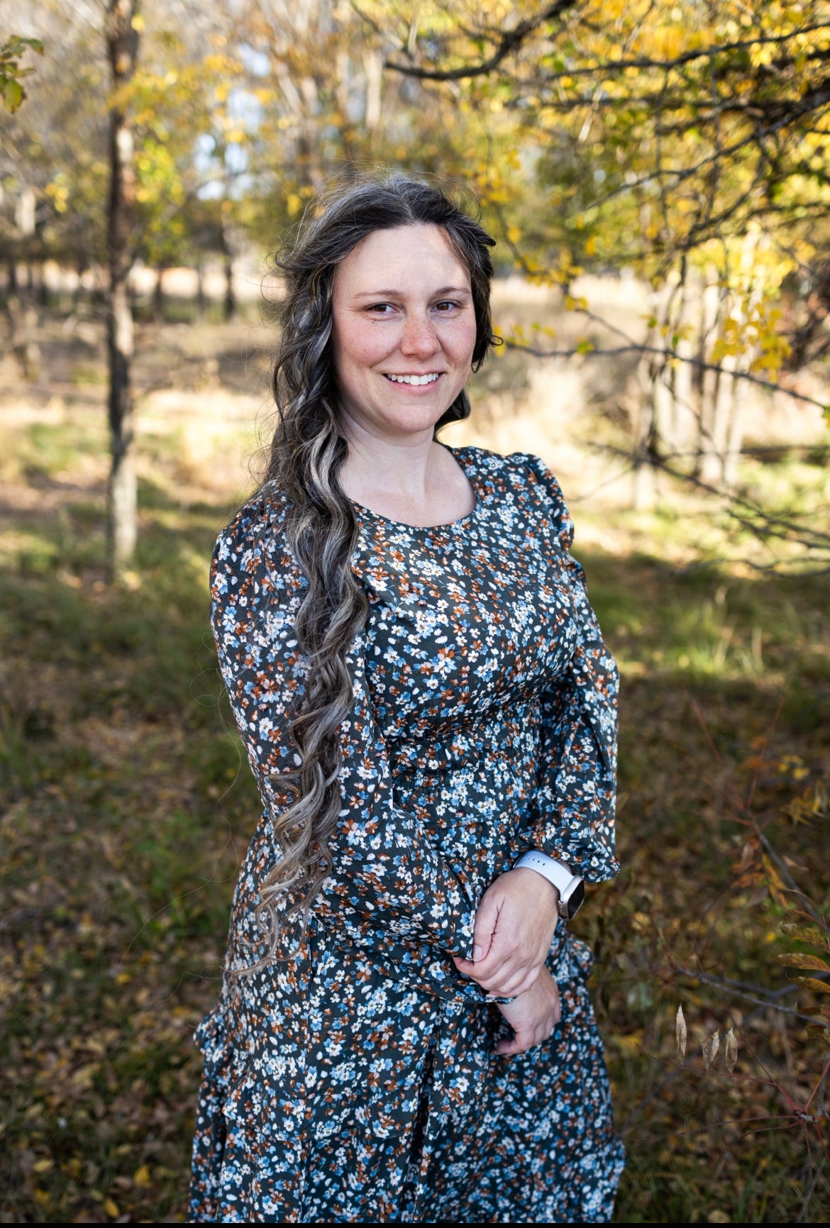 Teal and brown ditsy flowers dance across the fabric of this dress. Features include a cinched elastic waste, bishop sleeves, tiered skirt with ruffles, and POCKETS. The skirt is fully lined. Keyhole button closure on the back.
