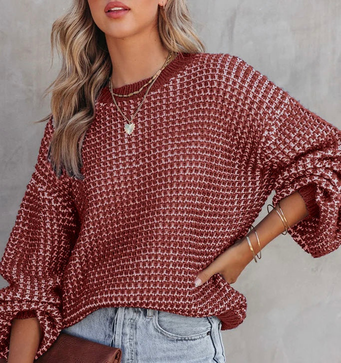 Comfy and stylish is what describes this sweater. Details include oversized look, puffed sleeves and a textured checkered fabric.