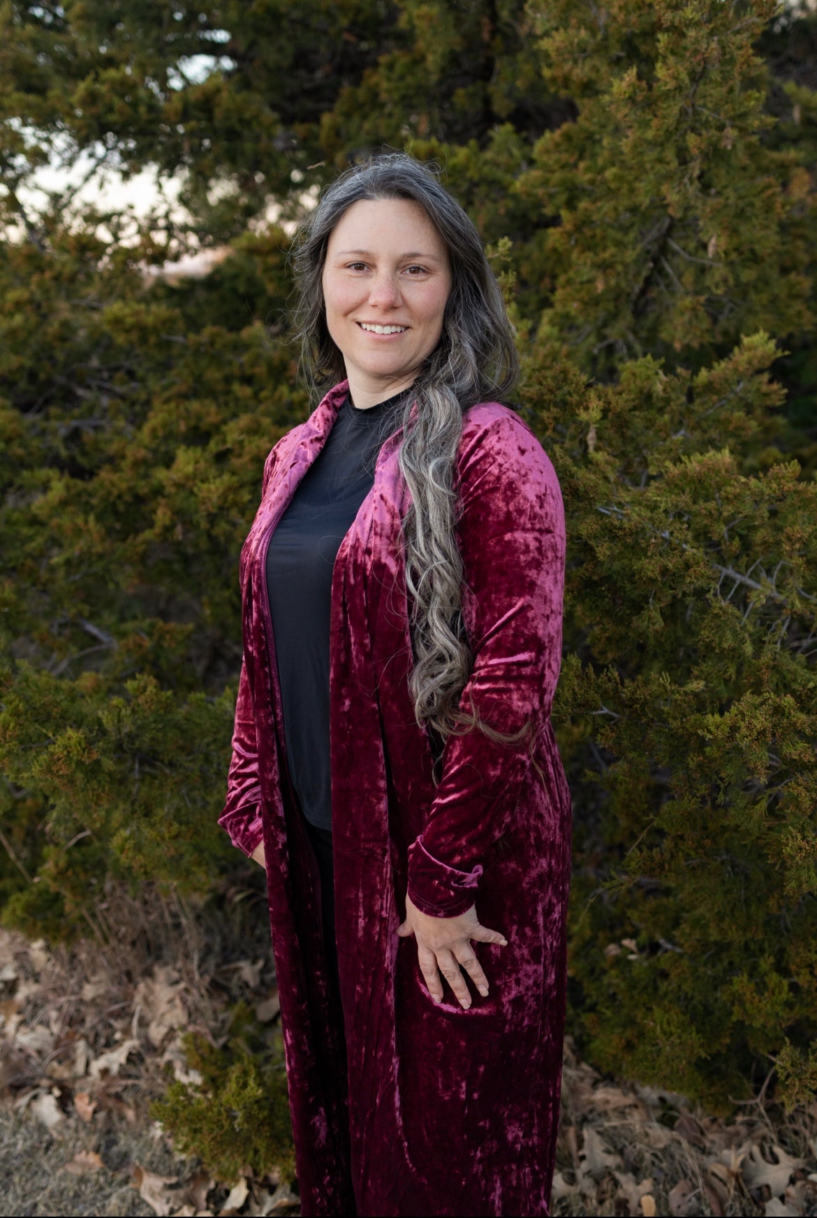 This collared duster can be dressed up or dressed down for a casual look. The crushed dark rose velvet fabric is perfect for fall and the holidays.