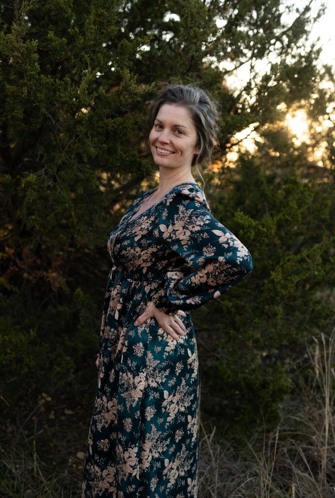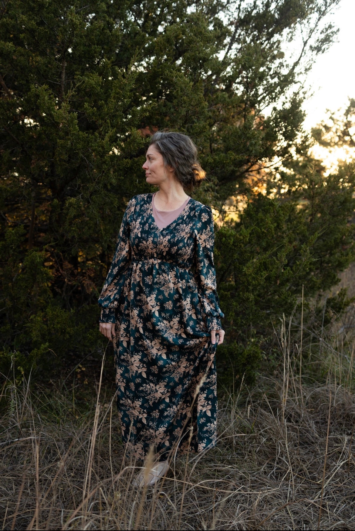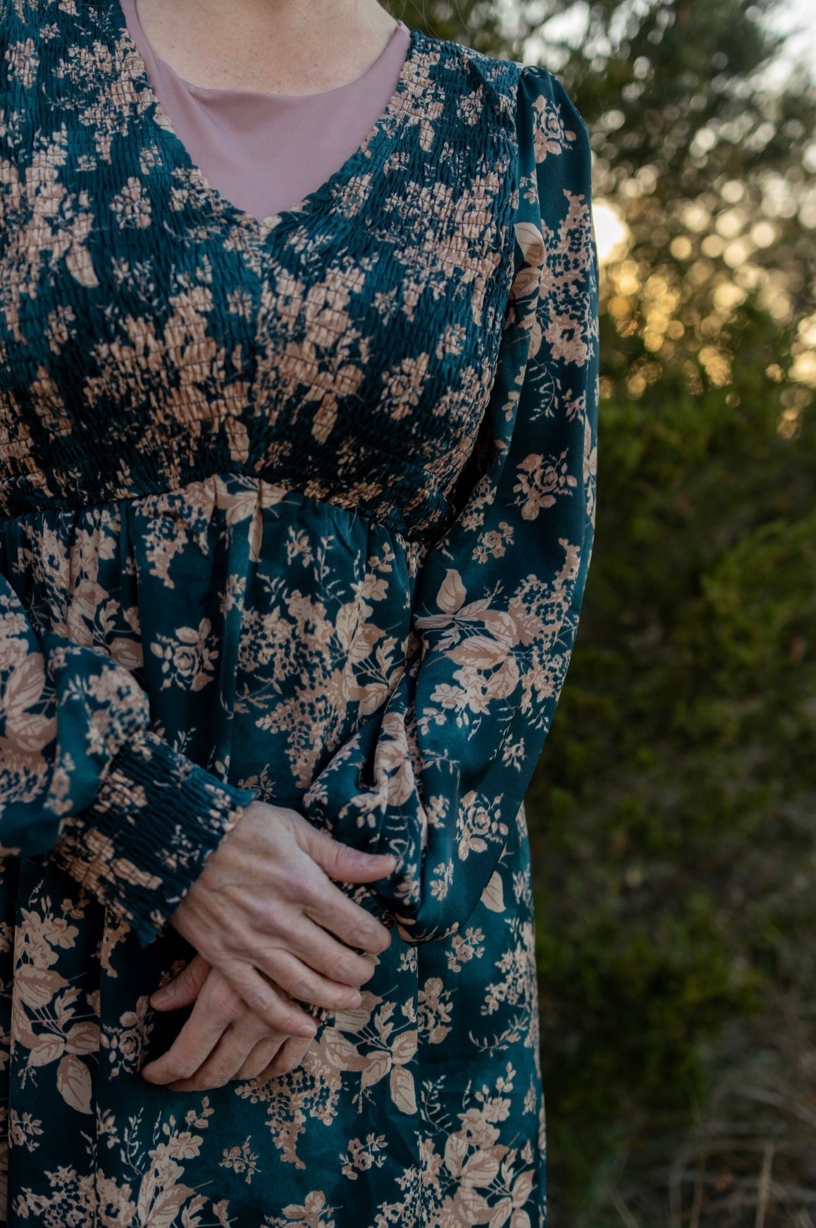 This deep teal floral dress features a V-neck with a smocked bodice. Fabric is polyester but has a satin feel. Other details include cinched cuffs on the sleeves and POCKETS.