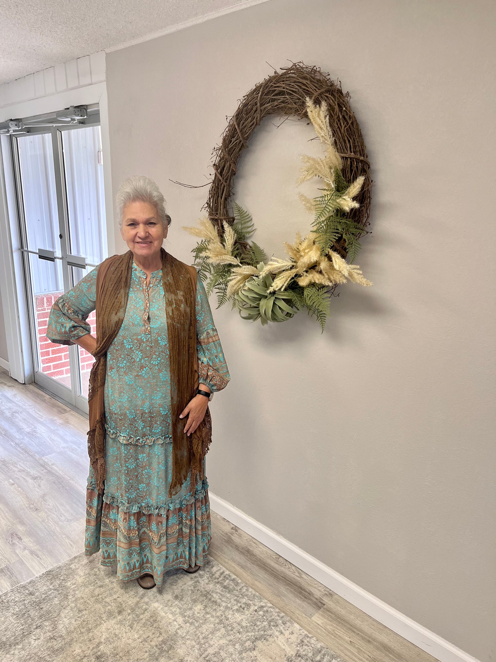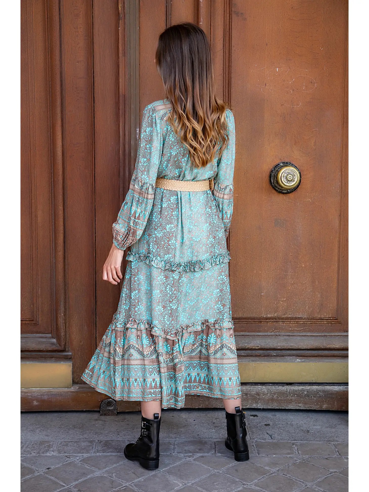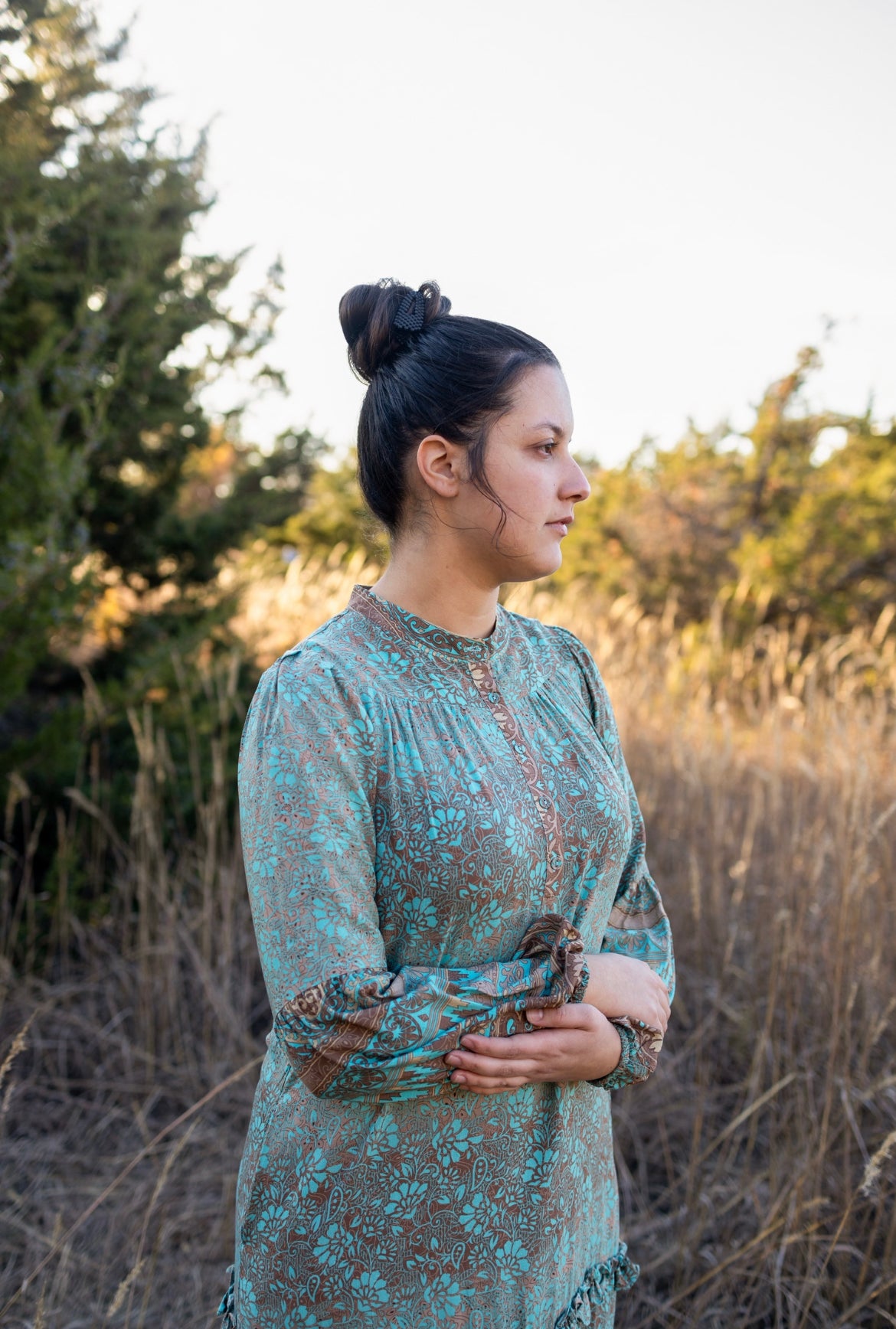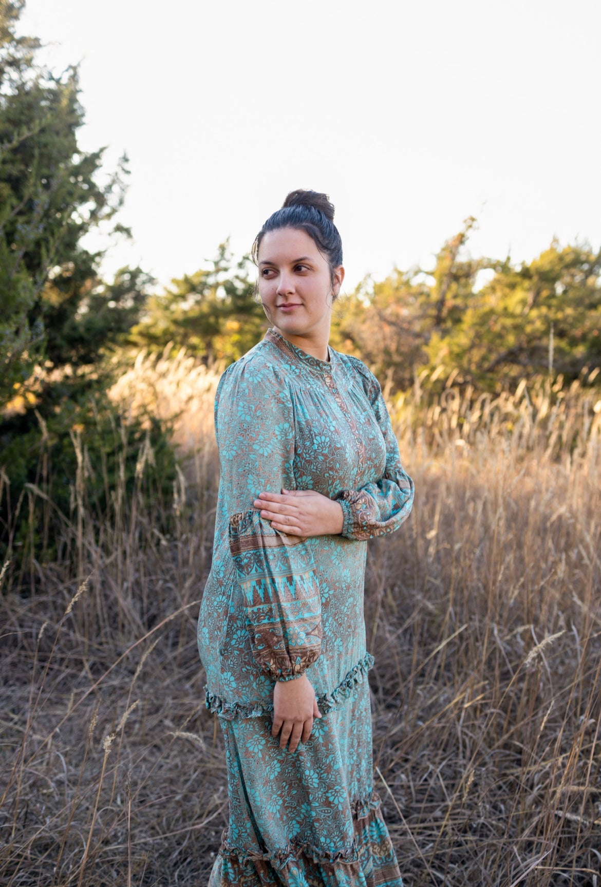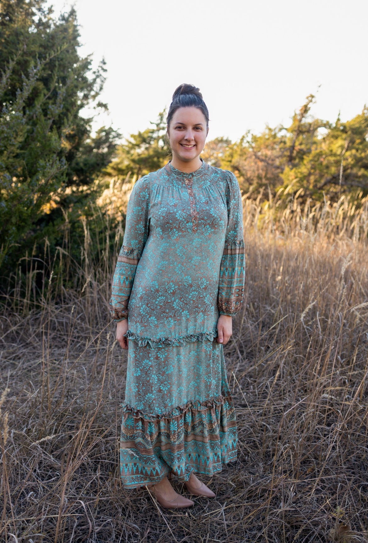 This boho maxi dress has a slight western feel with its teal and brown hues. Details include functional buttons, a tiered skirt with ruffles, as well as POCKETS. There is no lining but fabric is opaque.